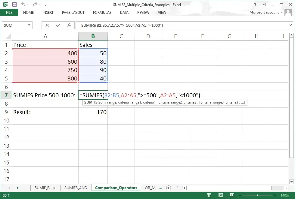 =SUMIFS(Sales_Amount, Price_Column, “>=500”, Price_Column, “<1000”)