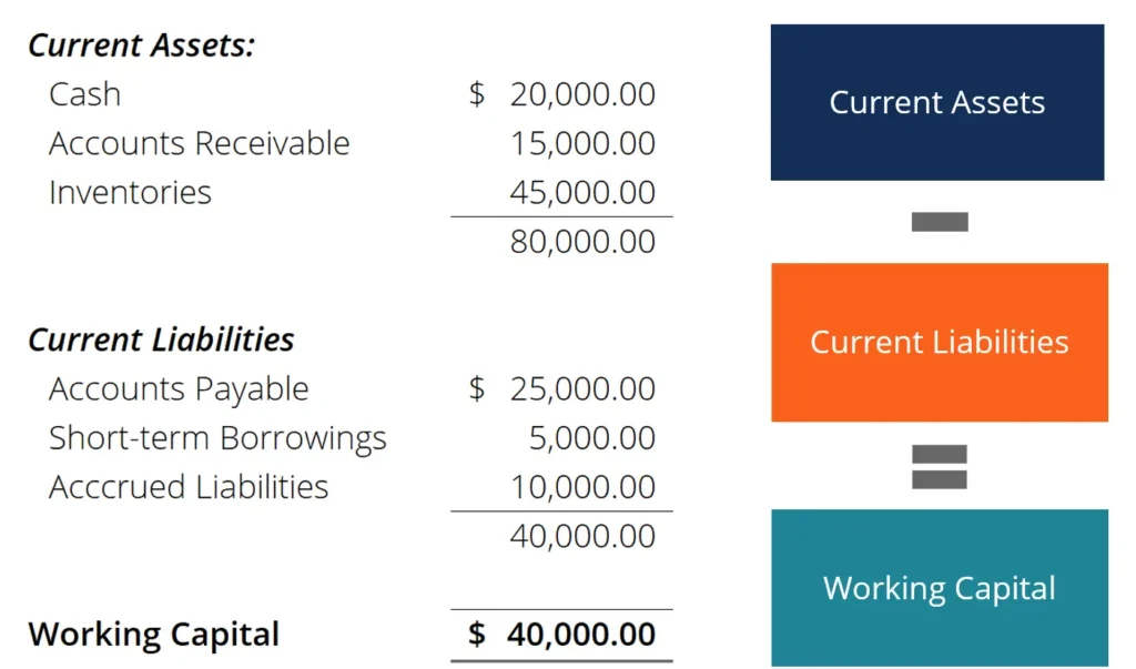 Suppose current assets total one hundred thousand and current liabilities total forty thousand. The working capital formula shows sixty thousand in working capitals. That difference supports daily operations.